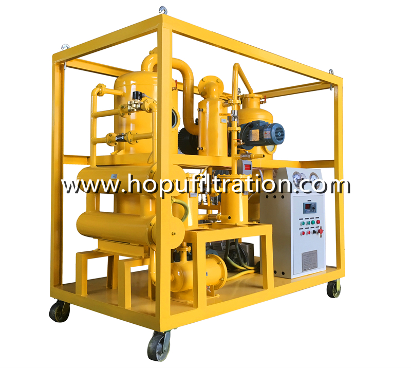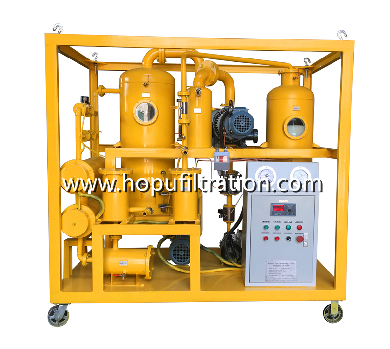HOPU ZYD-I Transformer Oil Regeneration Plant has been specially designed for on site use to completely regenerate insulating oils in de-energized transformers. Our machine provides regular oil purification such as degassing, drying and particulate removal but also can remove acidity, sludge, other soluble oil decay products and discoloration. This is accomplished by the use of high vacuum degasification technology and particulate filters combined with our special brand of earth. After treating, the oil can be reused as new. For special application, the system also can be mounted on a leak proof base and can be installed and operated on a trailer.