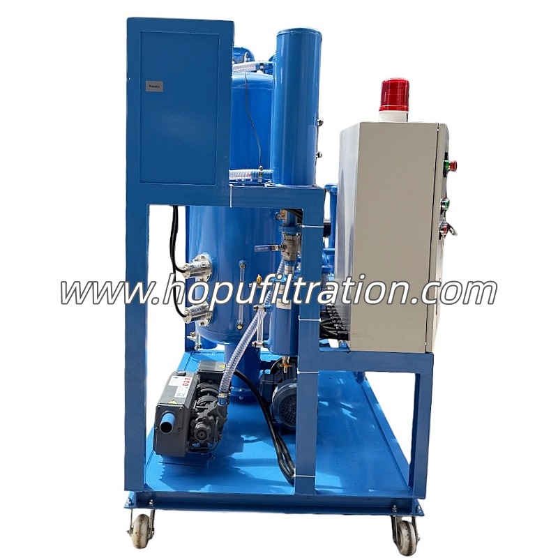 TYA Series Vacuum Hydraulic Lube Oil Purifier For Dehydration is mainly designed to purify various industrial waste oils with the viscosity lower than 320 mm²/s, such as turbine oil, mechanical oil, hydraulic oil and cooler oil cutting fluid , quench oil,high temperature chain oil, heat transfer fluids,bearing fluids, heat treatment quench oil,and different industrial oils, which are polluted by the water infiltration, emulsification and particle pollution etc. in the process of their production, transportation and usage. Through special design of the vacuum separation system and the impurity filtering system, HOPU oil purifiers can effectively filter out various pollutants in the oil. HOPU Vacuum Lube Oil Purifier For Dehydration has remarkable economic benefits, it will be an ideal choice for the plants maintenance service, energy-saving and cost-reducing.