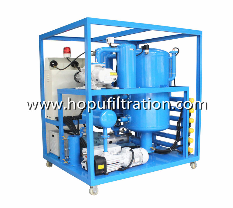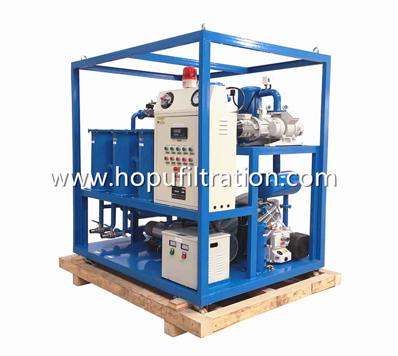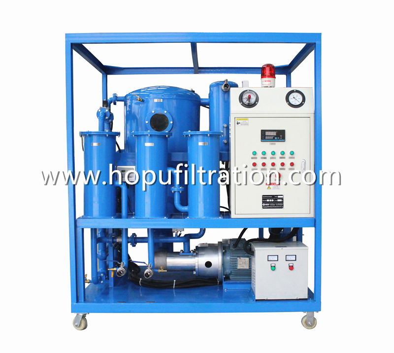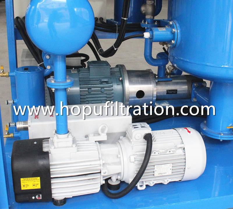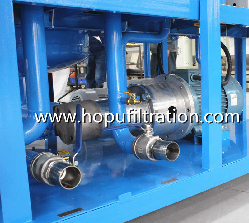 HOPU Advanced Type Two Stage Vacuum Transformer Oil Purifier is high quality and high efficiency, designed with world famous brand pumps, motors, accessaries,, which is widely used for industries of power plant, power station, electricity company, transformer factory, metallurgy, petrochemical, mechanical engineering, transportation, railway and transformers manufacturing etc. Especially, it applies to maintenance of transformers above 110KV and deep purification of high grade new transformer oil, imported transformer oil, mutual inductor oil and ultra high voltage transformer oil. It can be also used for oil vacuum filling and vacuum drying as well as transformer vacuum evacuation operation. Moreover, the machine can be working online without stop of transformers.